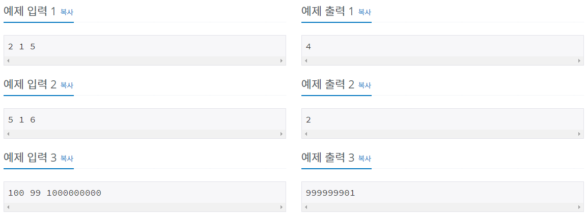 - 첫째 줄에 세 정수 A, B, V가 공백으로 구분되어서 주어진다. (1 ≤ B < A ≤ V ≤ 1,000,000,000)