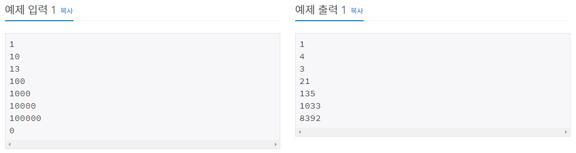 입력은 여러 개의 테스트 케이스로 이루어져 있다. 각 케이스는 n을 포함하는 한 줄로 이루어져 있다.
