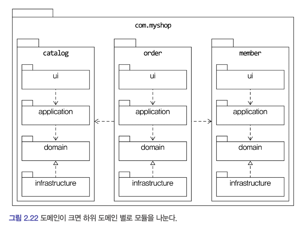 - 도메인이 크면 하위 도메인으로 나누고 각 하위 도메인 마다 별도 패키지를 구성한다.