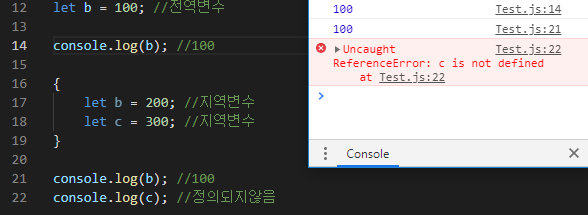 let선언 시 블록 레벨 스코프를 따르는 모습
