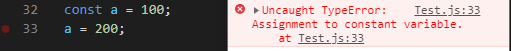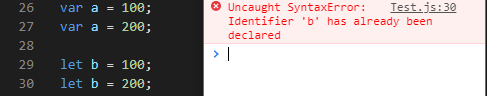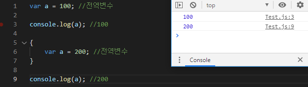 위와 같이 var키워드 특성 상 변수 a는 전역변수로 할당 되며 변수 a의 재정의, 재할당 하는것에 있어 문법적으로 문제가 없는 것을 확인할 수 있다. 이러한 경우 의도하지 않은 변수값의 변경이 일어날 가능성이 크다. 이것을 방지하기 위해 블록 레벨 스코프를 따르는 let키워드를 제공한다.
